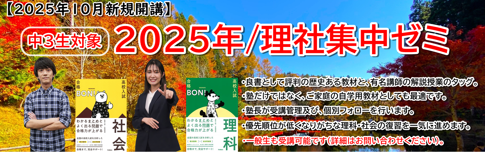 募集中 | 残り1名 | 11月より再開 | 11月より再開 | 理社ゼミ生のみ募集中 | 残り3名 |